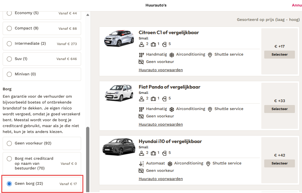 Tip! In boekingstap 1 kun je filteren op verschillende typen borg, zoals borg met pinpas en contante waarborg.